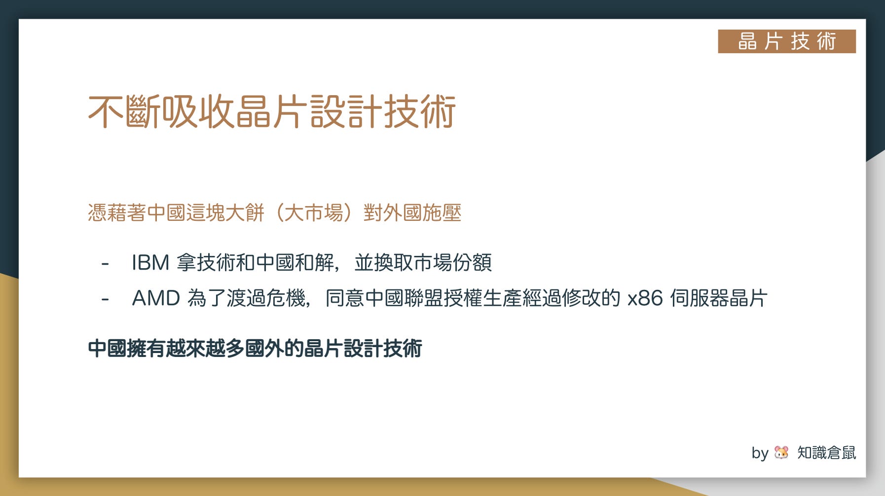 中國政府利用市場運作、資金誘因以及准入壓力等手段,讓 IBM、AMD、ARM 等公司主動向中方轉移關鍵技術,加速中國在晶片領域的自主化處理程序,已初見成效。