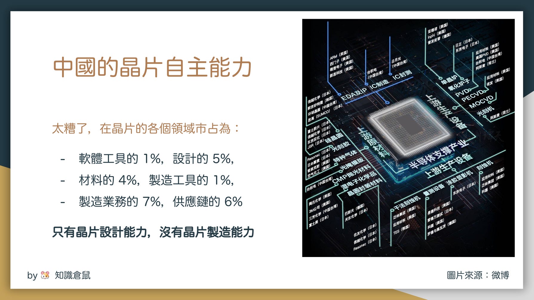 中國在矽晶圓和其他晶片製造材料的市占率是 4%;在晶片製造機台的市占率是 1% ;而在全球晶片設計的市占率是 5%。