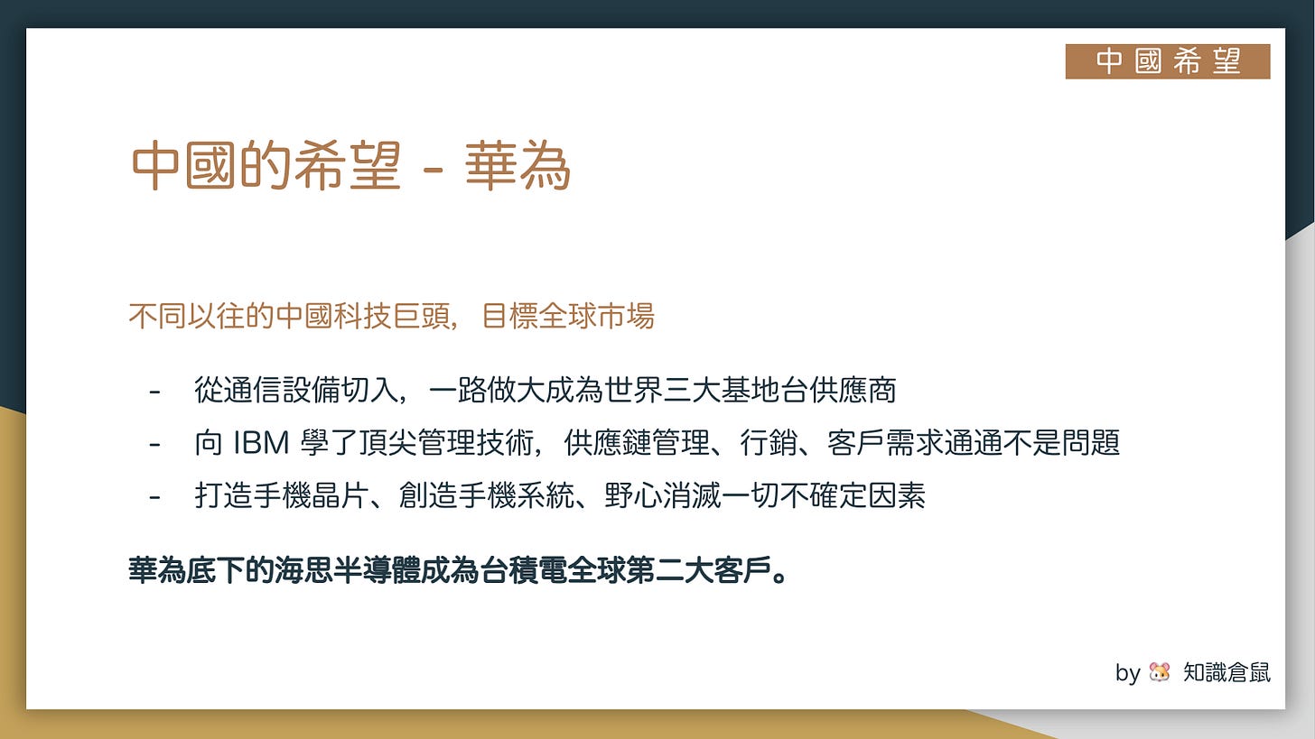 華為的一路竄起勢如破竹,一開始的通訊設備造就華為的優勢基底,然後學習西方的管理技術,在中國政府的後盾支持下,發展了手機晶片、手機系統以及手機設備。