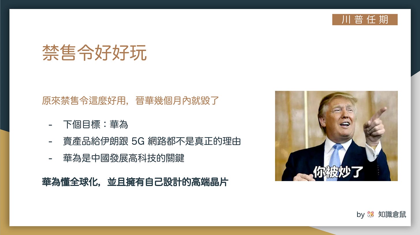 原本歐巴馬政府要透過『限制美國公司向中興銷售產品』來懲罰,結果 2017 年中興跟美國簽署了一份認罪協議然後交罰金,所以沒有被罰。