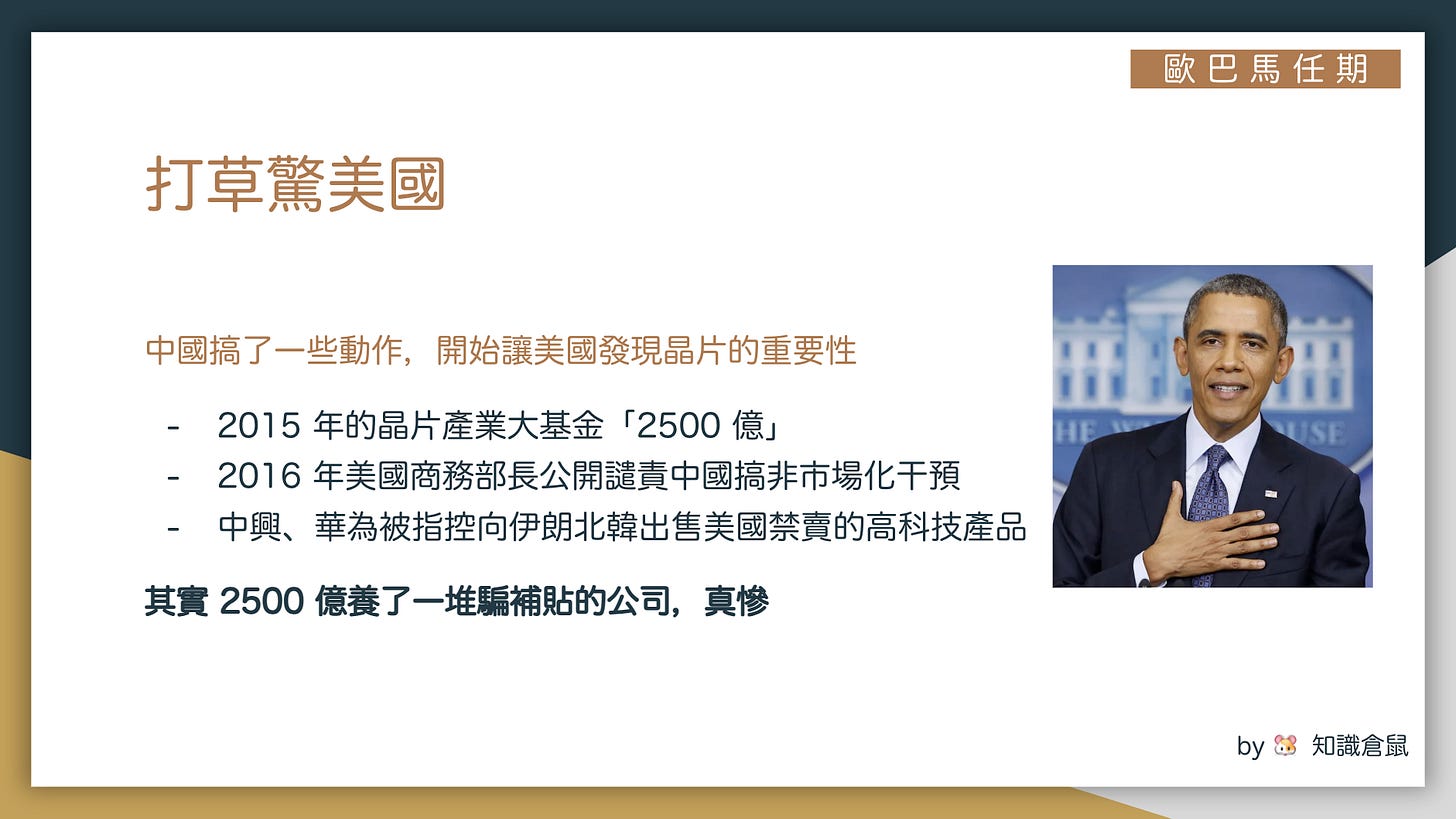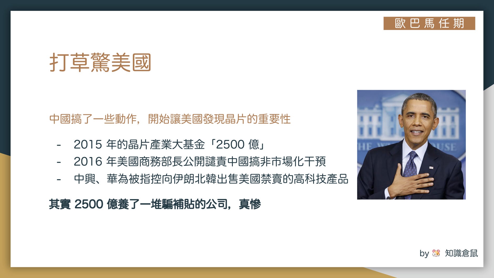 一直到 2015 年以前,美國政府因為不夠瞭解半導體行業,一直不認為中國的半導體發展有什麼問題,直到中國的『半導體 2500 億晶片補貼大禮包』驚動了歐巴馬政府。