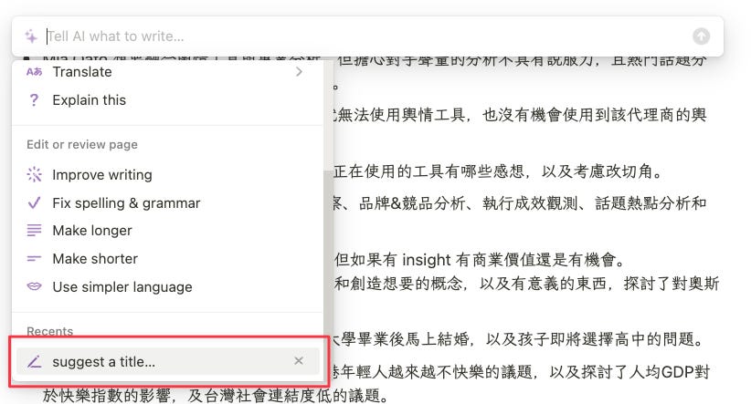 整理完後,直接請它幫你建議一個標題,再加上時間,一個簡略的重點整理就完成了。