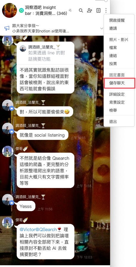 這邊以好友 Frank 的洞察酒吧社群為例,點選視窗右上角三個點的『儲存聊天』,但這邊要特別說明,文件會儲存到什麼時間段取決於你聊天內容讀取到哪,也就是對話往上滑了多少。抓取前務必特別留意。