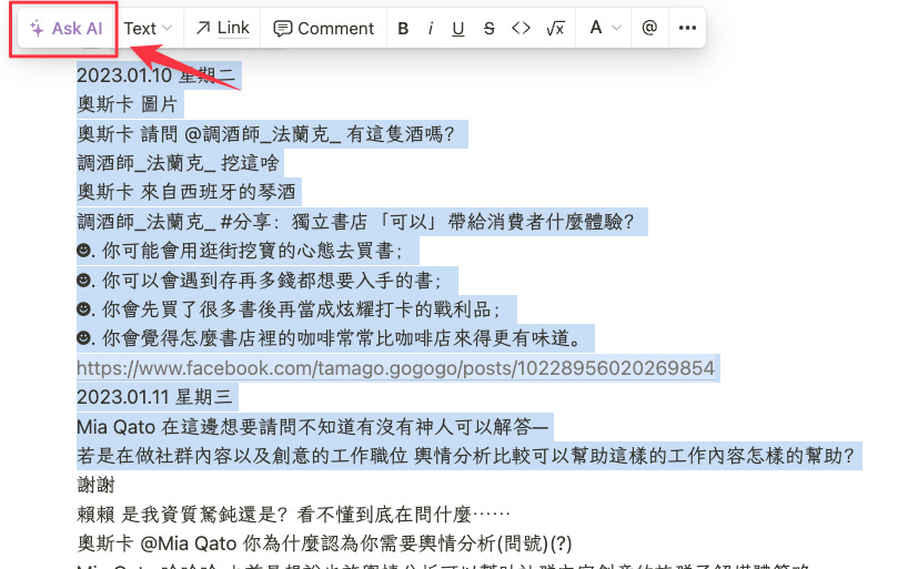 選取一段話,並點擊『Ask AI』(notion AI 有讀取上限,建議不要整篇文章全選)